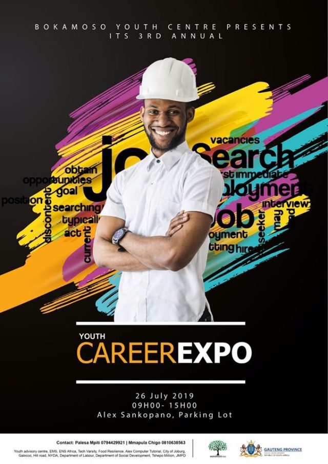 Home Alex Pioneer Bokamoso Youth Centre Annual Career Expo Alex PioneerEducationNews Bokamoso Youth Centre Annual Career Expo July 24, 2019 2107 0 Facebook Twitter Google+ Pinterest WhatsApp Aexandra community is invited to a career expo happening Friday 26 July. At Alexandra San Kopano parking lot.